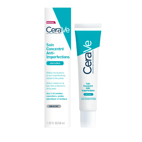 Le Soin Concentré Anti-Imperfections de CeraVe est un soin quotidien complet qui réduit les boutons et imperfections des peaux grasses à tendance acnéique : jusqu’à 40% de boutons en moins après 3 jours d’utilisation*. Formulé à partir d’une haute concentration d’acides glycolique et lactique (AHA) ainsi que d’ acide salicylique (BHA), connus pour leurs propriétés exfoliantes, il désincruste et resserre les pores, tout en réduisant les imperfections : boutons, points noirs, lésions inflammatoires, rougeurs, papules et pustules. Il aide à uniformiser la texture de la peau.